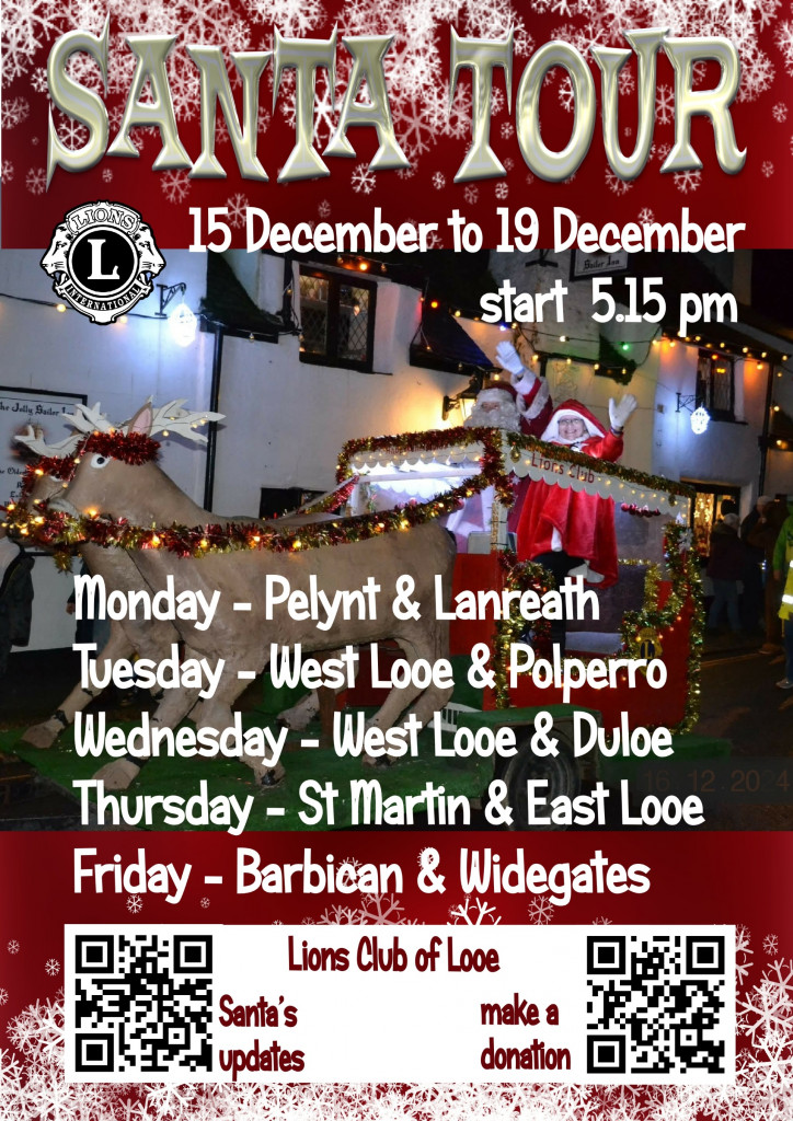 Santa has confirmed that he will be available to visit Looe from 15th to 19th December.